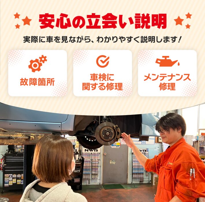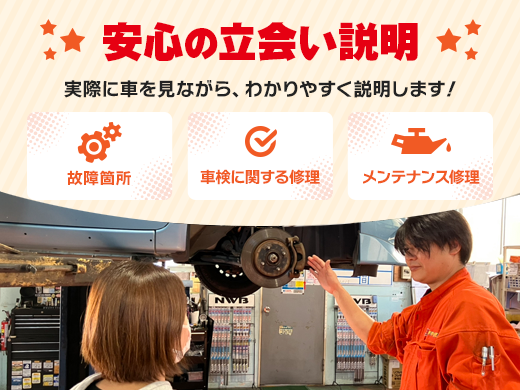 立ち会い車検をすることで、ムダな作業による費用負担が発生せず、整備士と一緒にお車の状態をご確認いただけます。お車の使用状況やご予算のご希望に沿った整備内容をご提案いたします。ご安心ください。